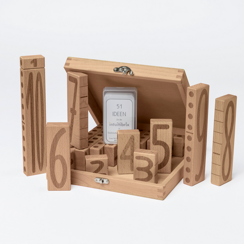 Besonders hervorzuheben ist die Holzbox, die durch die Anordnung der Elemente eine Hundertertafel visualisiert und zusätzliche Strukturhilfe bietet. Die Punkte auf den Seiten zeigen die Kardinalität, die 5er-Bündelung unterstützt die simultane Zahlauffassung.