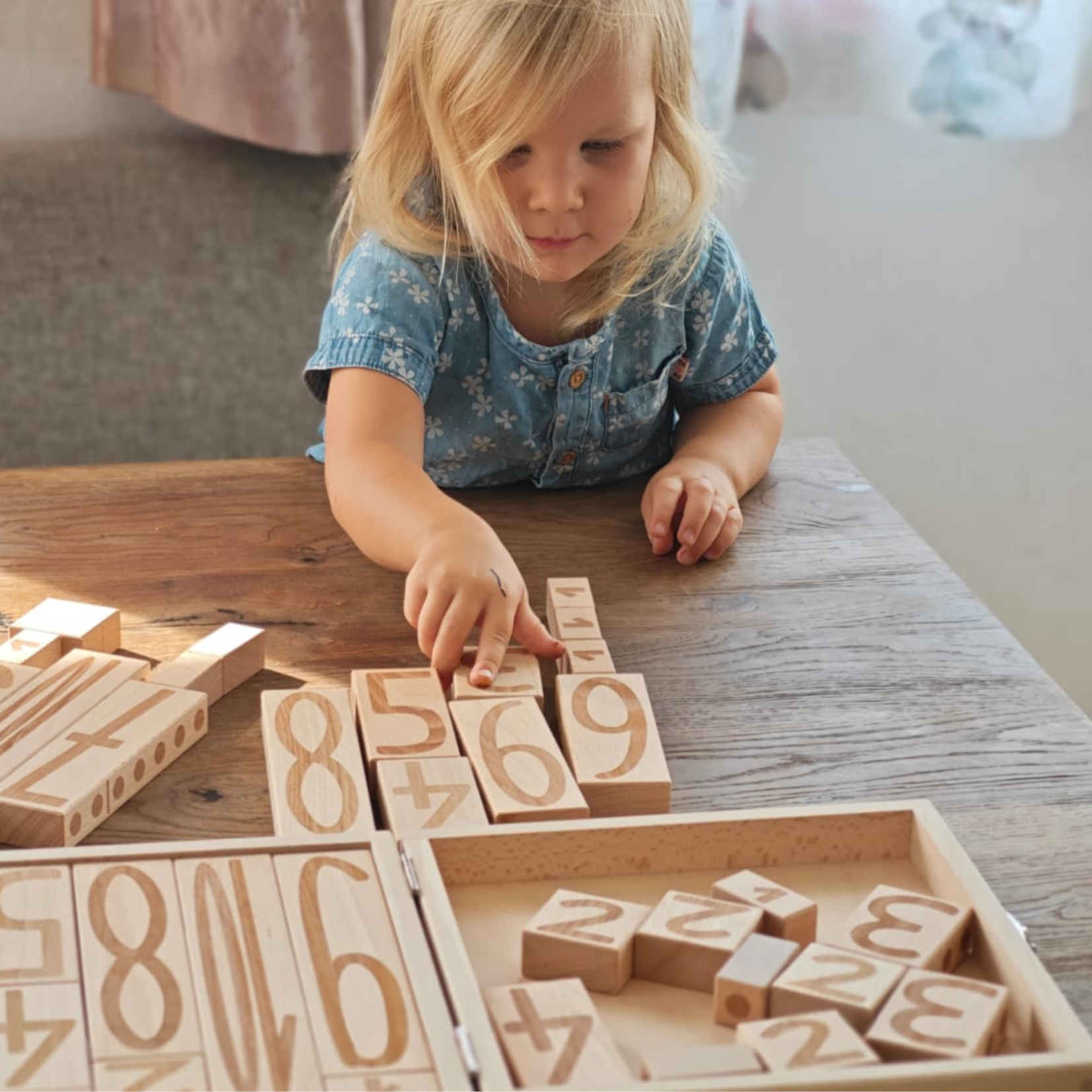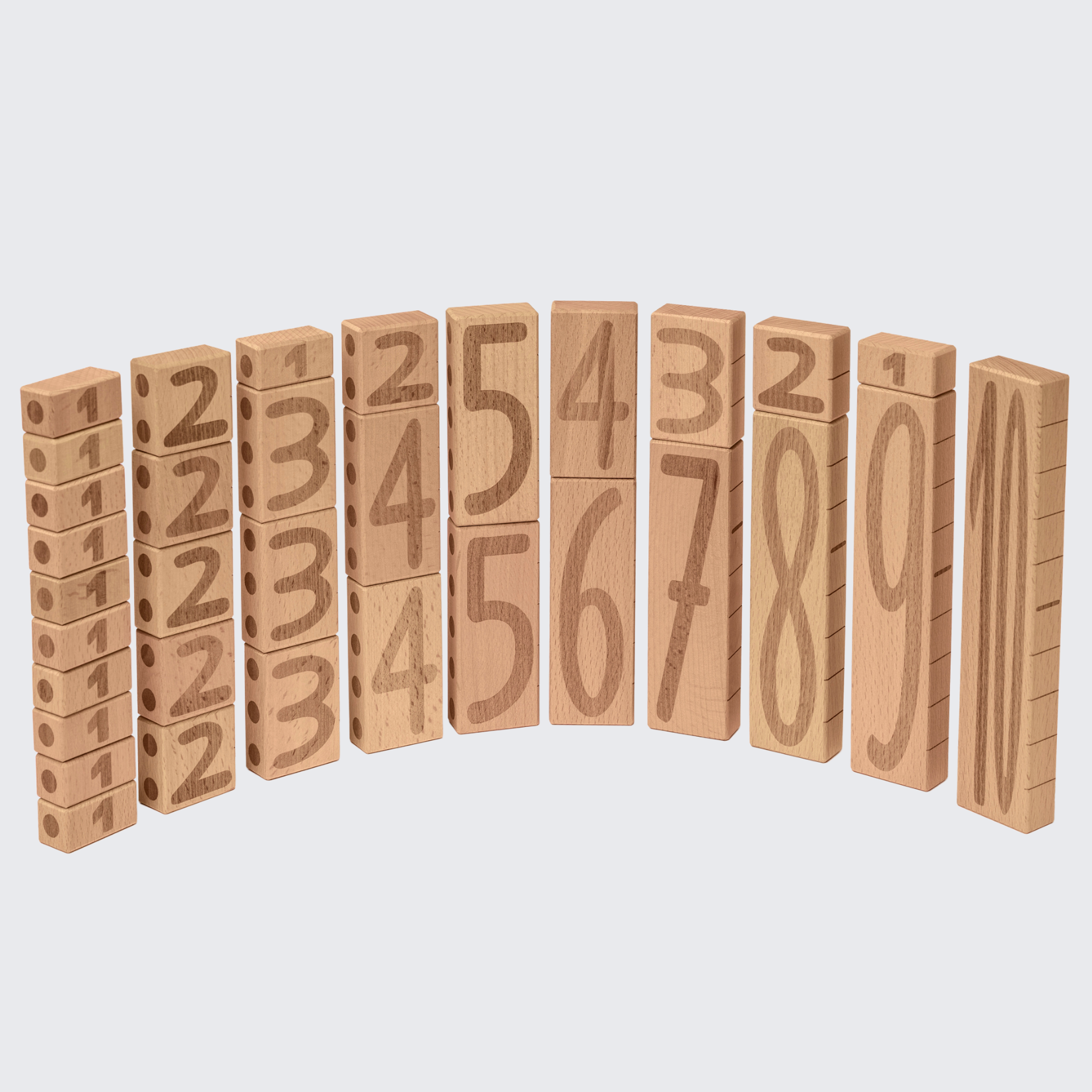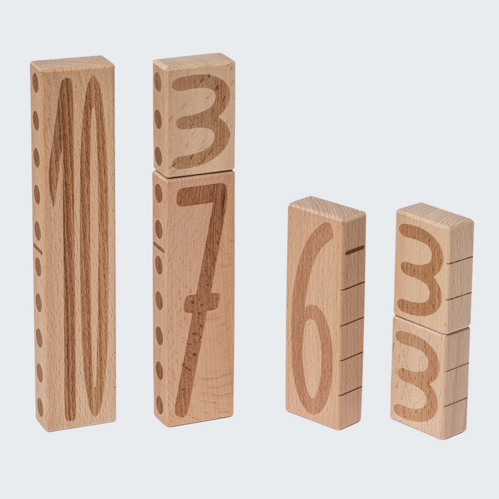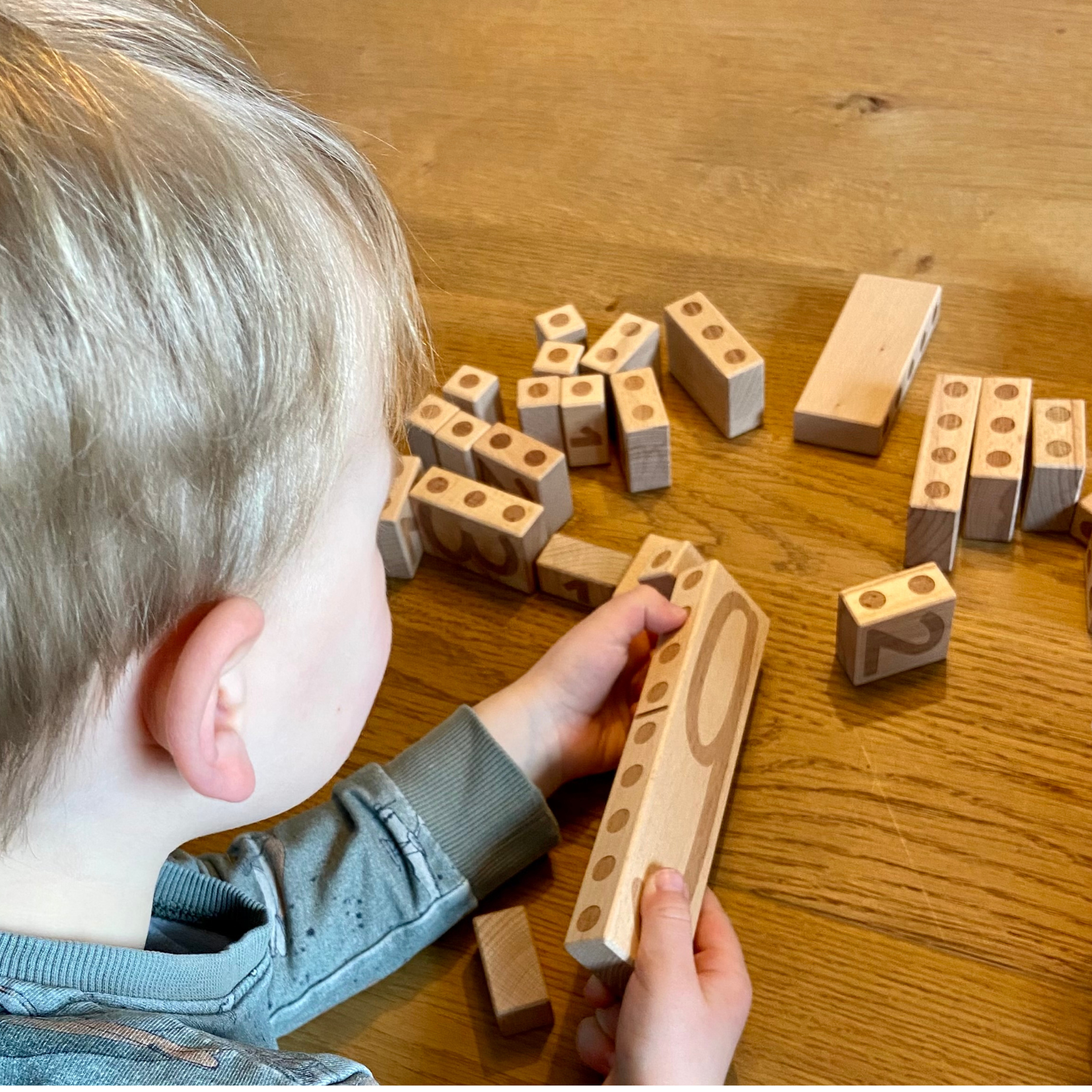 Wenn ein Kind die Zahlen lernen möchte, kann man die Bausteine mit der Zahlenseite hinlegen oder hinstellen und nach einzelnen Zahlen fragen. Z.B. “Zeige mir die 7!” Schwieriger ist es, wenn man auf eine Zahl deutet und fragt: “Wie heisst diese Zahl?” Wenn das Kind schon zählen kann, kann es selber den Baustein umdrehen und sieht dann, wie die entsprechende Anzahl als Ziffer aussieht.