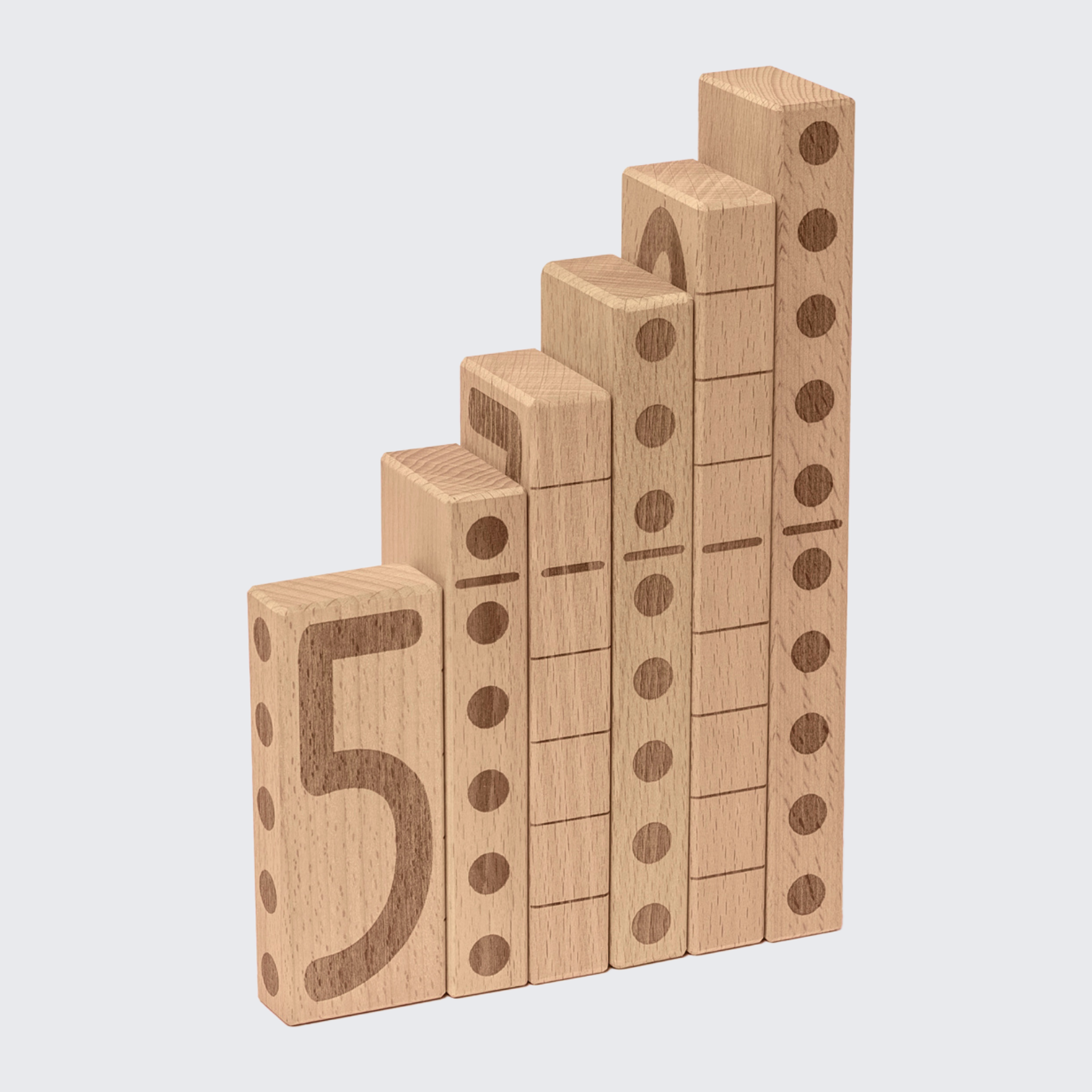 Dabei ist wichtig, dass das Kind eine Menge auf einen Blick erkennt und nicht jedes Mal die Felder zählen muss. Da man normalerweise nur Mengen bis 5 simultan erfassen kann, haben die Bausteine 6 bis 10 eine breitere Linie in Höhe der 5. Dadurch werden z.B. auch Rechnungen mit Zehnerübergang einfach.