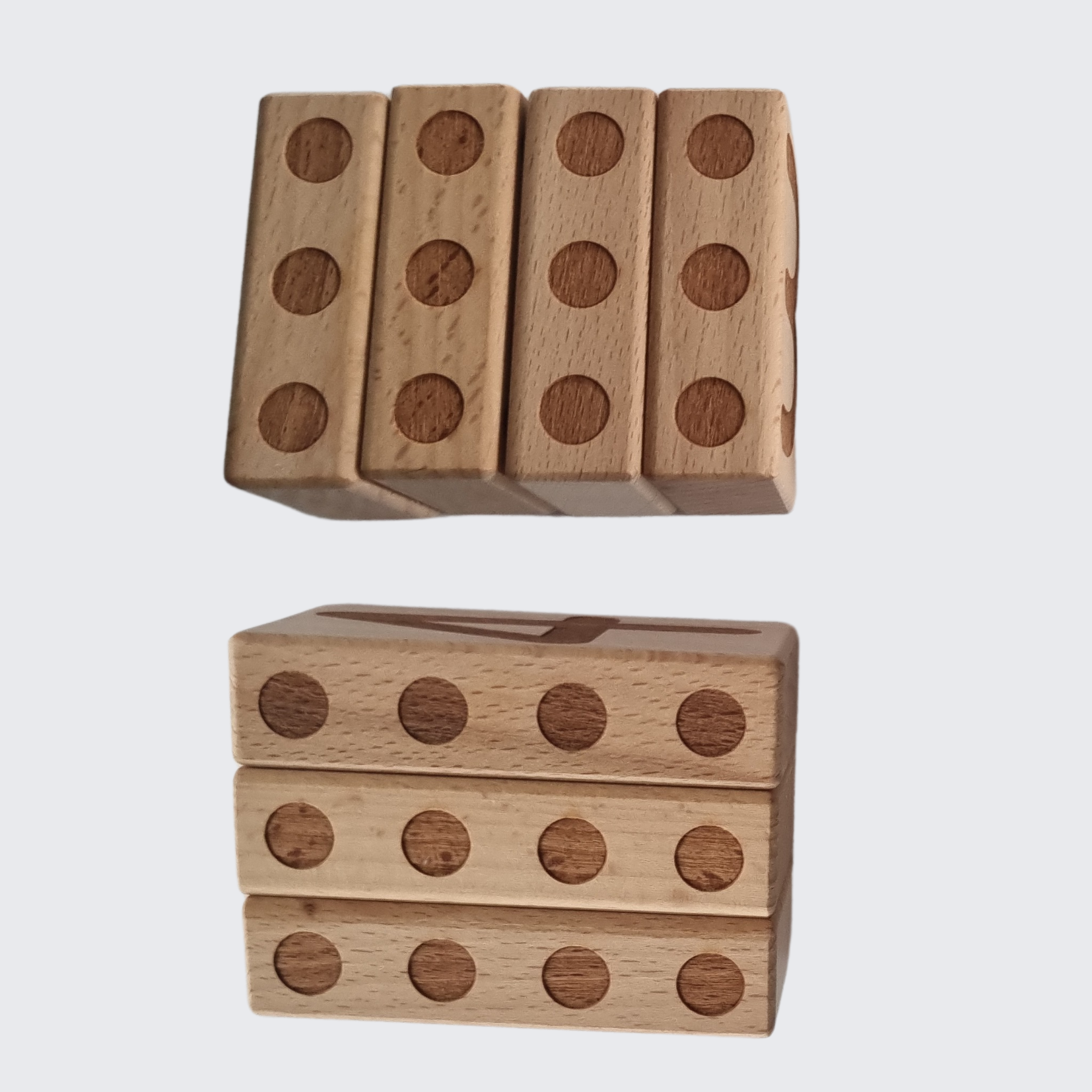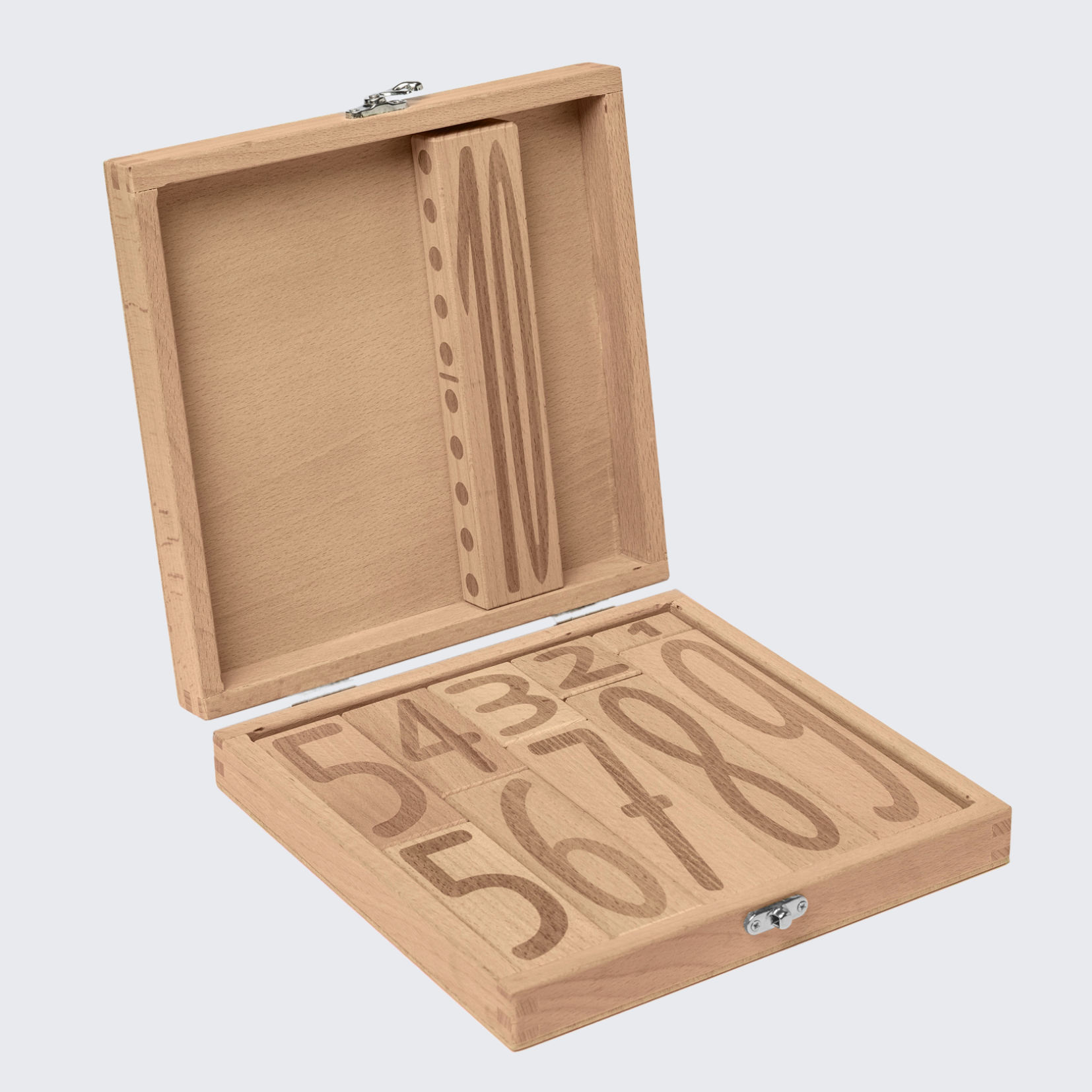 Das Basisset intuitibrix in der Kiste oder im Stoffbeutel besteht aus 1 Zehner, 1 Neuner, 1 Achter, 1 Siebener, 1 Sechser, 2 Fünfer, 3 Vierern, 4 Dreiern, 7 Zweiern und 12 Einern.