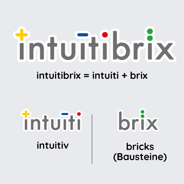 intuiti kommt von intuitiv und brix vom englischen Wort brick. Es bedeutet also intuitives Lernen mit Bausteinen. Gerne wollte ich 4 mal das i, damit ich die 4 Rechenzeichen im Logo unterbringen kann.